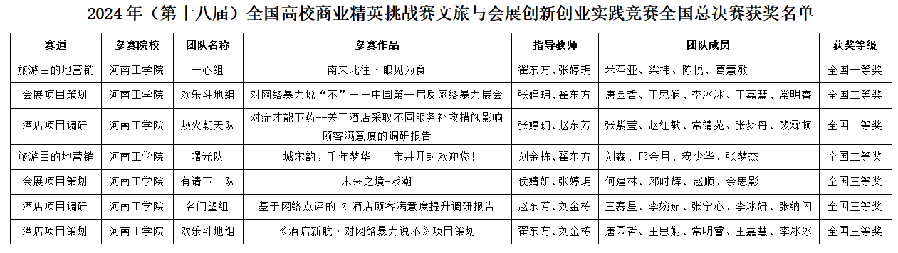 2024年1月全国高校商业精英挑战赛文旅与会展创新创业竞赛启动,历经数月的激烈角逐,于11月完成国赛评比。我院参赛学生团队在指导教师的悉心辅导下,深入挖掘文旅与会展行业的创新点,精心策划旅游目的地营销、酒店调研和会展项目方案,最终取得一等奖1项、二等奖3项、三等奖3项的优异成绩,同时,我校获最佳院校组织奖。