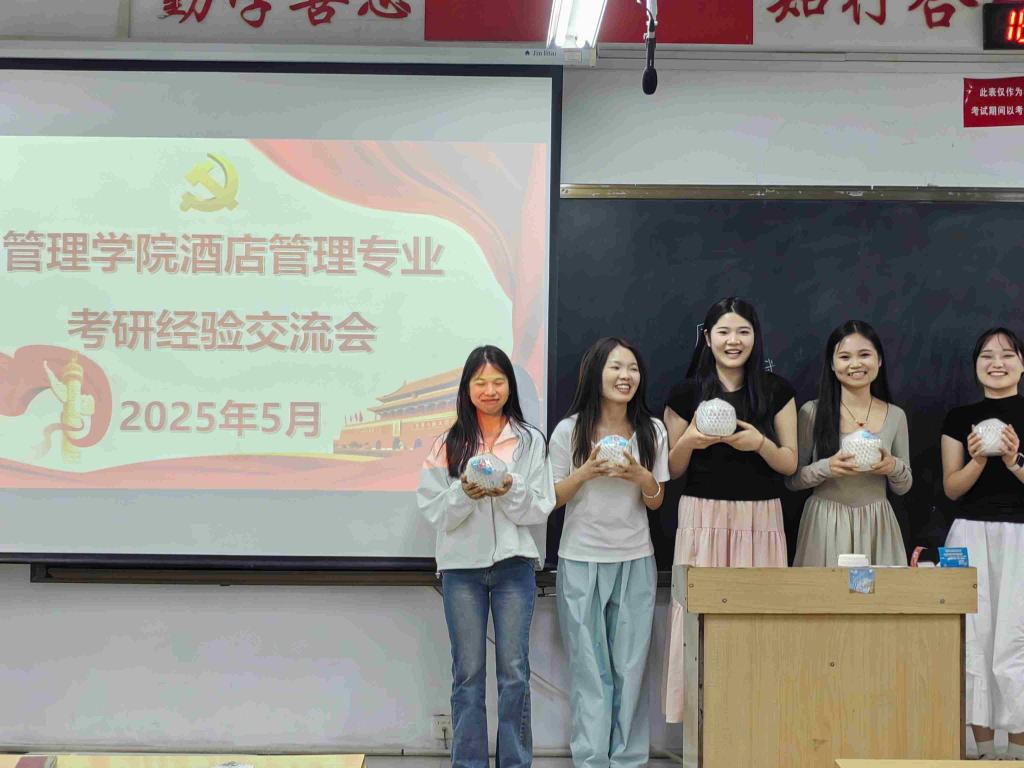 酒店管理211班胡佳林、岳萌阳、刘秋芸、孟小婷、刘玉格等5位同学依次为大家分享了考研经验和心路历程。她们从选择学校和专业的角度出发,详细讲述了自己的备考策略和复习方法。