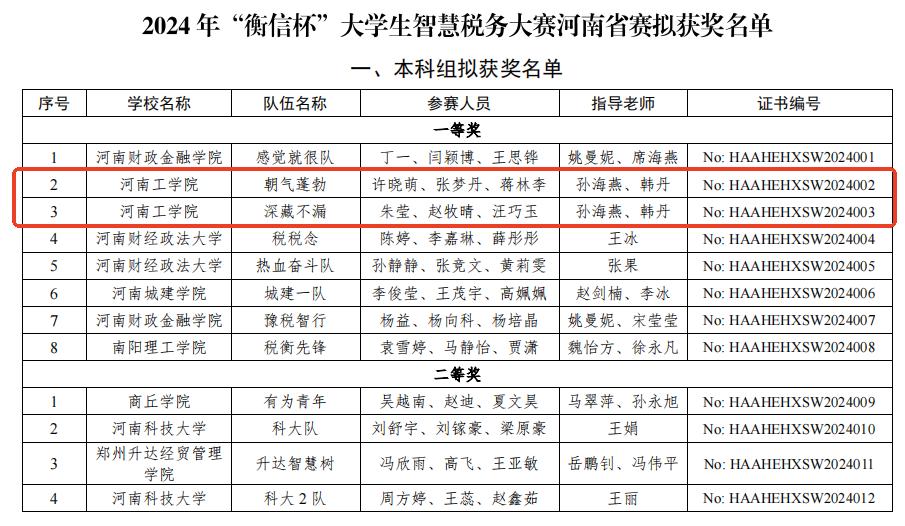 本次河南省赛由全国产教融合创新创业联盟财政税务委员会主办,河南财政金融学院承办,浙江衡信教育科技有限公司提供技术支持。大赛以3人一组团体形式参赛,分为增值税报税、企业所得税报税、个人所得税报税3大岗位,涉及全面数字化的电子发票开具,一般纳税人增值税及附加税费申报,税务数字账户操作,查账征收企业所得税年度汇算清缴,个人所得税预扣预缴申报,个人所得税生产经营所得汇算清缴等内容,大赛结果系统自动进行综合评分,最终经审核无问题后公布最终排名结果。本次省赛囊括了75所省内本科院校的225名学生选手参赛。我院财务管理专业经过校赛选拔,最终选拔出许晓萌、张梦丹、蒋林李、朱莹,赵牧晴、汪巧玉两个团队六位同学参加省赛。在备赛期间,指导教师精心辅导,学生积极备赛,沉稳比赛最终分别以第二名和第三名的好成绩同时获得省赛一等奖,两队均顺利晋级国赛。本次大赛充分展示了我院学子的税务专业技能水平,也彰显了我院在智慧税务教育领域的优秀教学成果及实践能力,为我院赢得了荣誉。