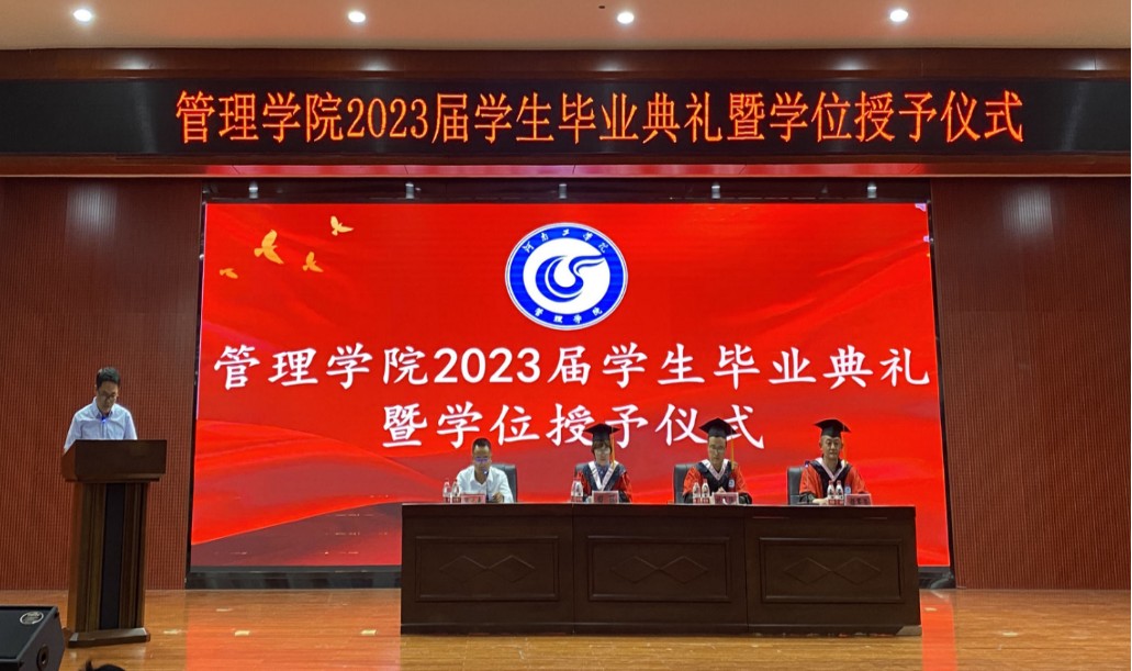 六月蝉鸣又起,青衿之志可期。2023年6月9日下午,管理学院于创新楼报告厅隆重举行2023届学生毕业典礼暨学位授予仪式。管理学院院长田丽教授、副院长刘勇强教授、副院长姬军荣教授出席毕业典礼,典礼由副书记张元春主持,与会的还有毕业班辅导员、教研室教师代表和2023届毕业生。