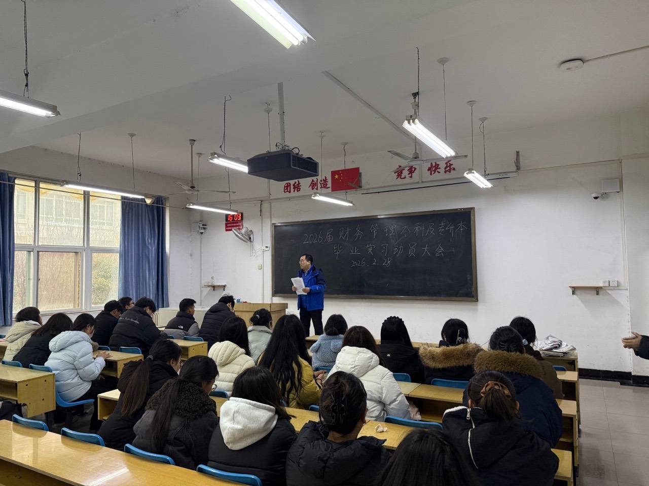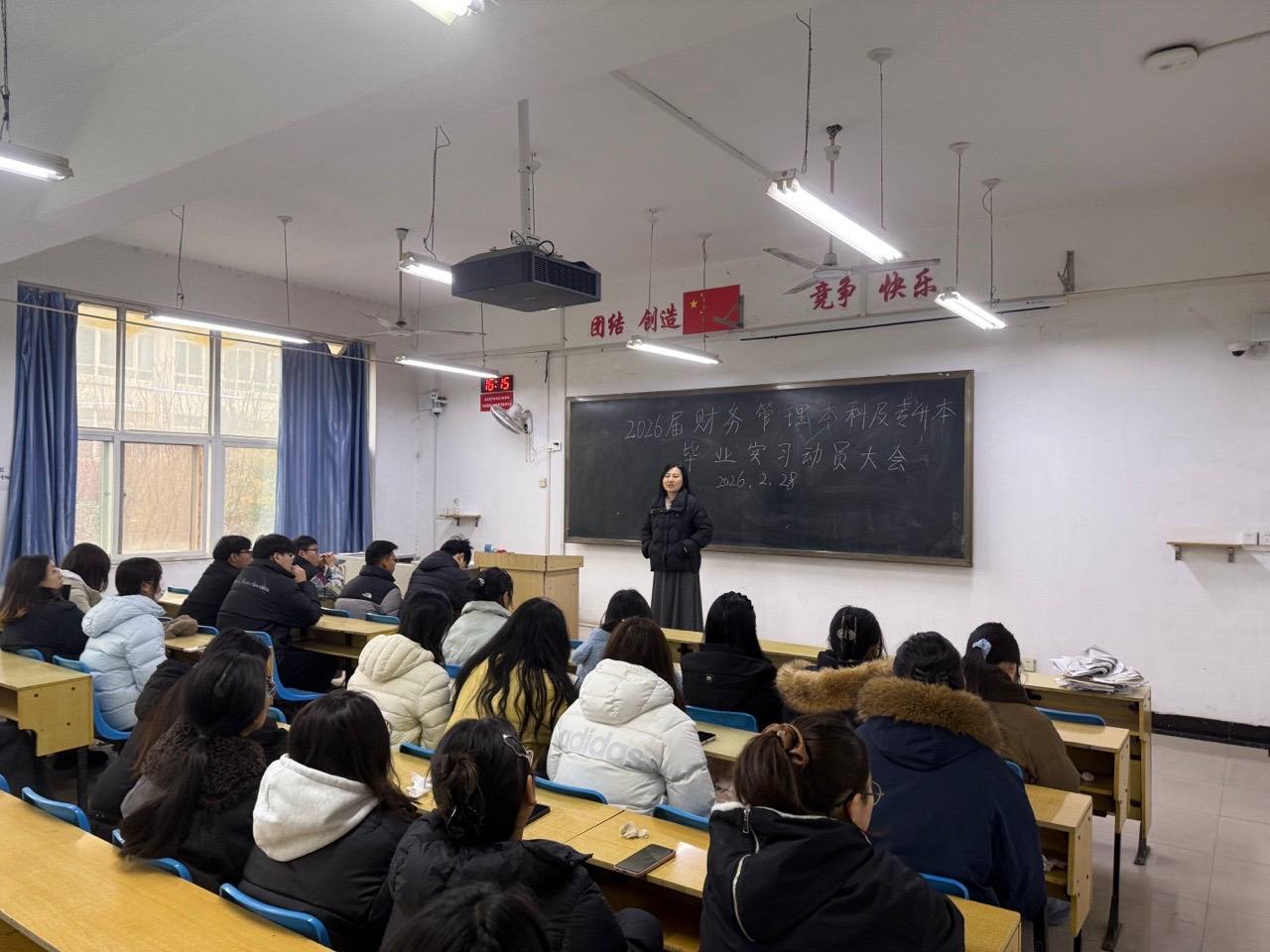 为扎实推进学生毕业实习工作,确保毕业实习质量和效果,切实加强实习组织与管理,把好实习安全和质量关。2026年2月28日下午,财务管理专业在教2楼B203召开了2026届毕业生毕业实习动员大会。会议由财务管理教研室李彩主持,教研室孔祥威、程文建、武宇辉等毕业实习指导老师以及财务管理专业毕业生参加此次动员会。